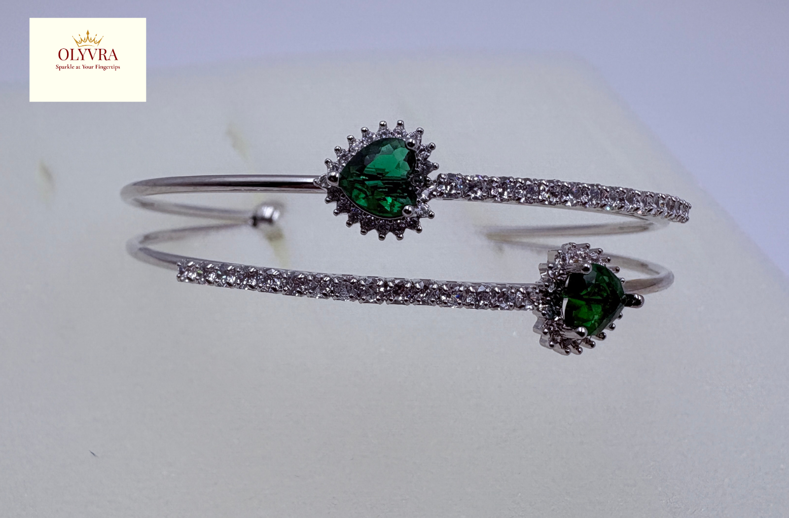 A chic and modern double-band open bangle featuring two vibrant Green heart-shaped stones at each end, surrounded by a sparkling halo of clear cubic zirconia. The bangle’s sleek silver plating is elevated with a band encrusted in dazzling white stones, making it a statement piece for any outfit.